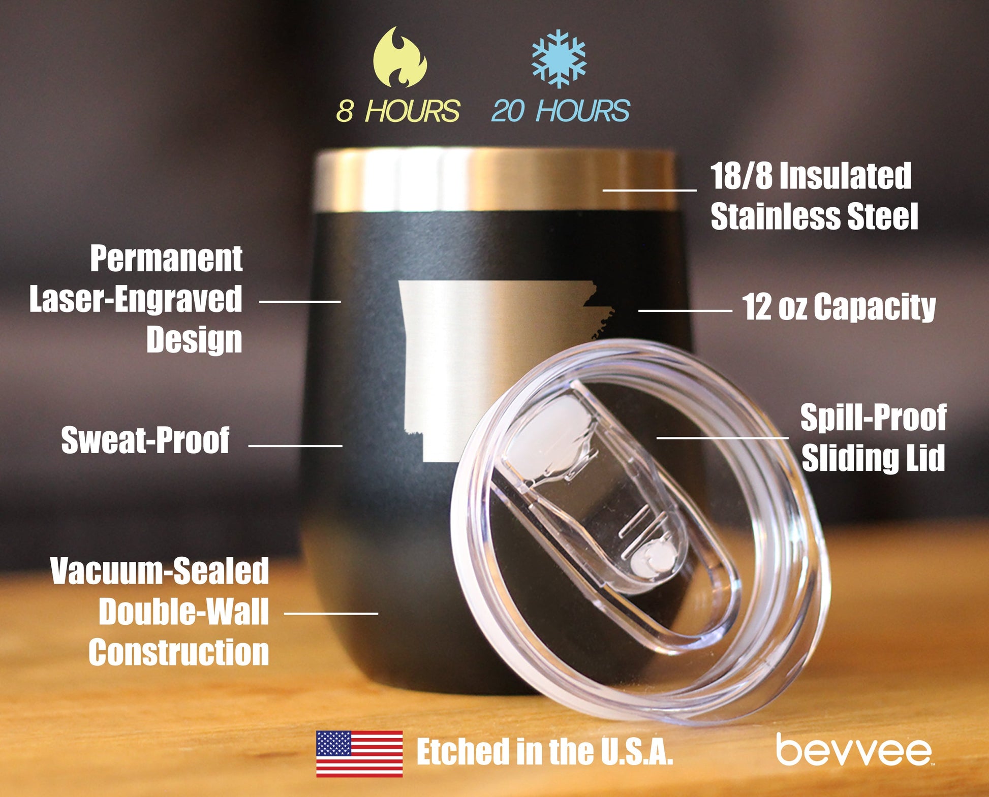 Our 12oz. stemless wine tumblers with sliding lids feature stainless steel double-wall construction, vacuum insulated for 2X cold and heat retention compared to glass or plastic containers! Etched in America.